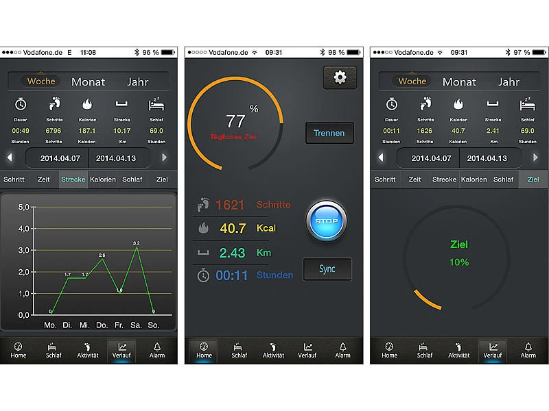 - Schlaf-Modus: Zeichnet den Schlaf auf und analysiert, wie lange und wie gut Sie schlafen.