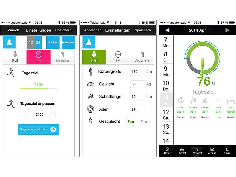 - Gratis-App (iOS und Android) für Einstellungen, Auswertungen und Diagramme: einfaches Synchronisieren z. B. mit iPhone ab 4s, iPod touch (iOS 6.0 und höher), Samsung Galaxy S4, Galaxy Note, ab Android 4.3 und höher(Bitte prüfen Sie welche Android-Version Ihr Smartphone verwendet!)